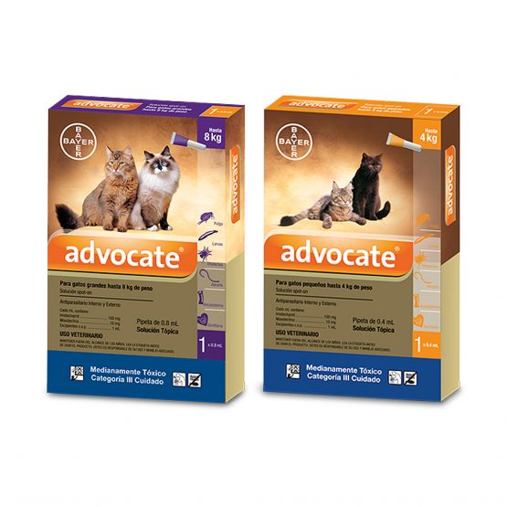 Advocate® Gatos es el antiparasitario en pipeta para mascotas más completo del mercado, ofreciéndoles una protección superior contra los principales parásitos externos e internos. Advocate® Gatos es usado para el tratamiento y control de las pulgas Ctenocephalides spp., tratamiento de la infestación por el ácaro del oído Otodectes cynotis, tratamiento de la demodicosis causada por Demodex cati, Notoedres cati, control de la infestación por el parásito del corazón Dirofilaria immitis, larva L3 y L4, tratamiento de las infestaciones por nemátodos gastrointestinales: larva L4, adultos inmaduros y adultos de Toxocara canis, Ancylostoma caninum y Uncinaria stenocephala y adultos de Toxascaris leonina y Trichuris vulpis.