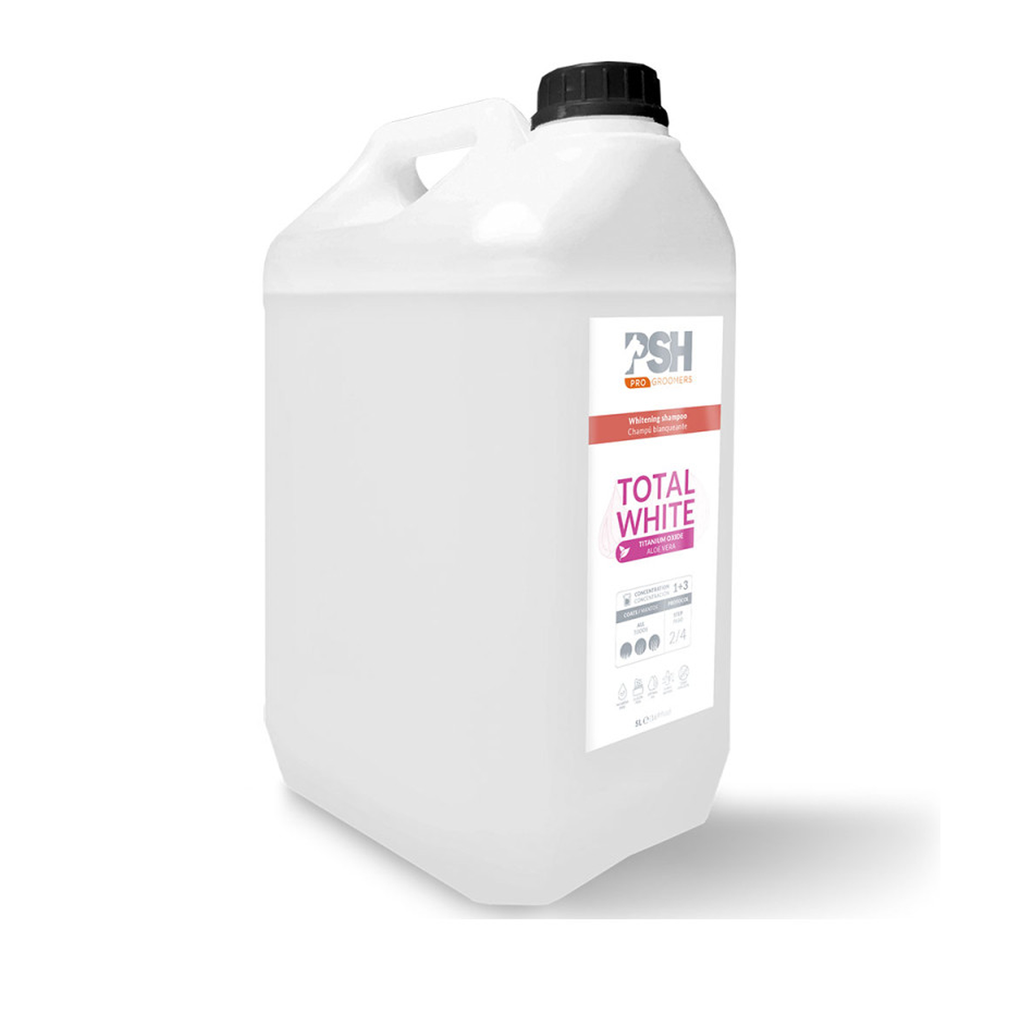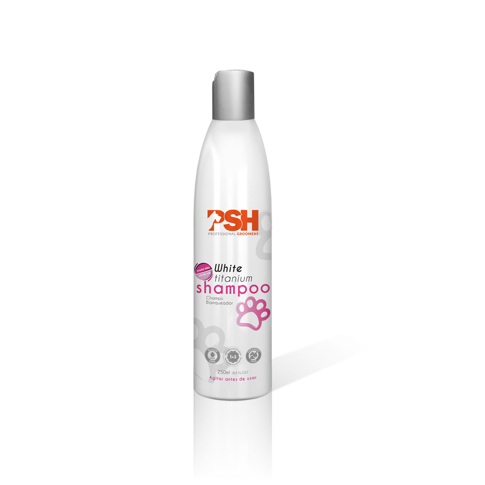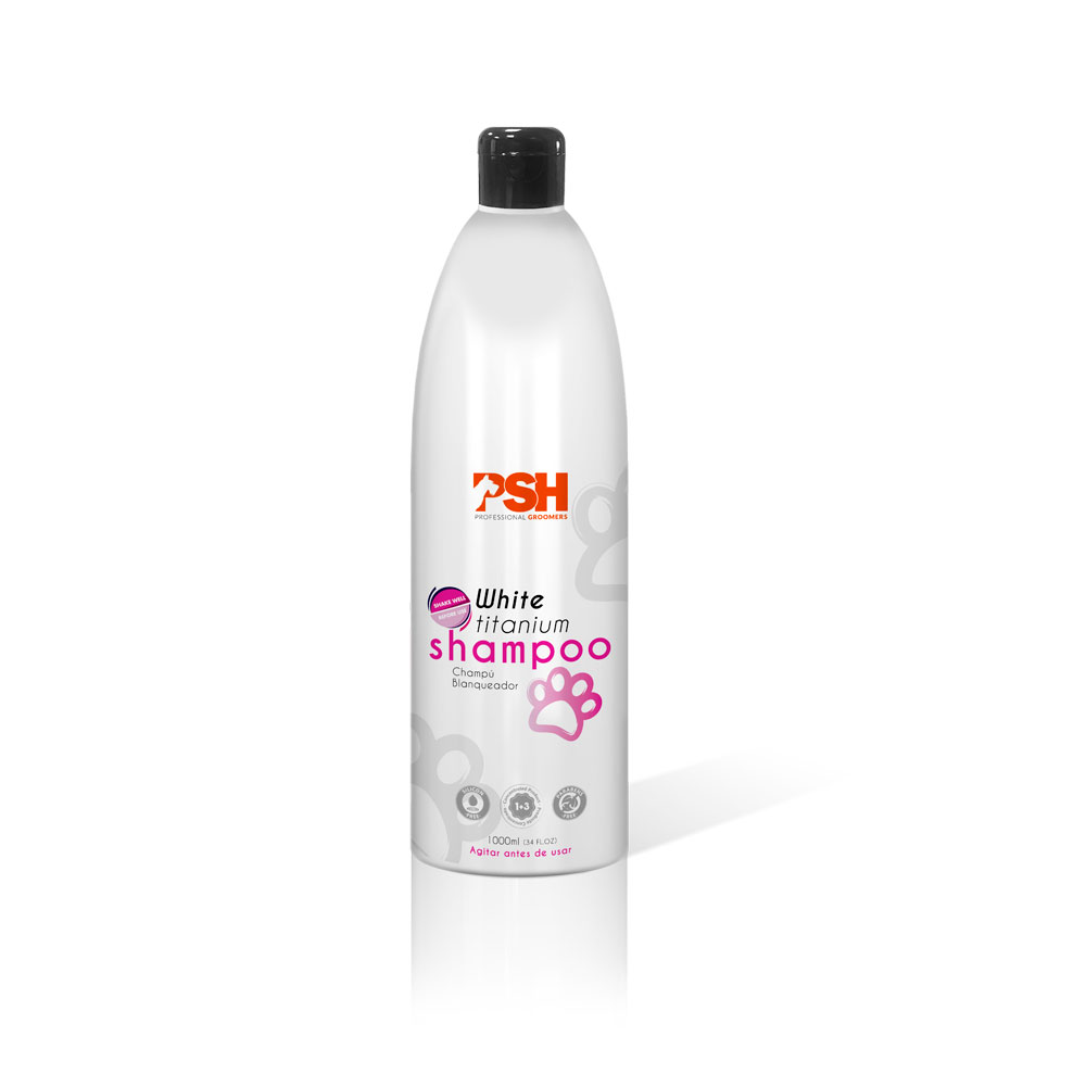 El nuevo Champú Blanco TITANIO de PSH está especialmente formulado para conseguir el blanqueo de perros de manto blanco y delicado. El altísimo poder blanqueante de sus componentes hace que el manto recobre una espectacular blancura y una gran luminosidad.