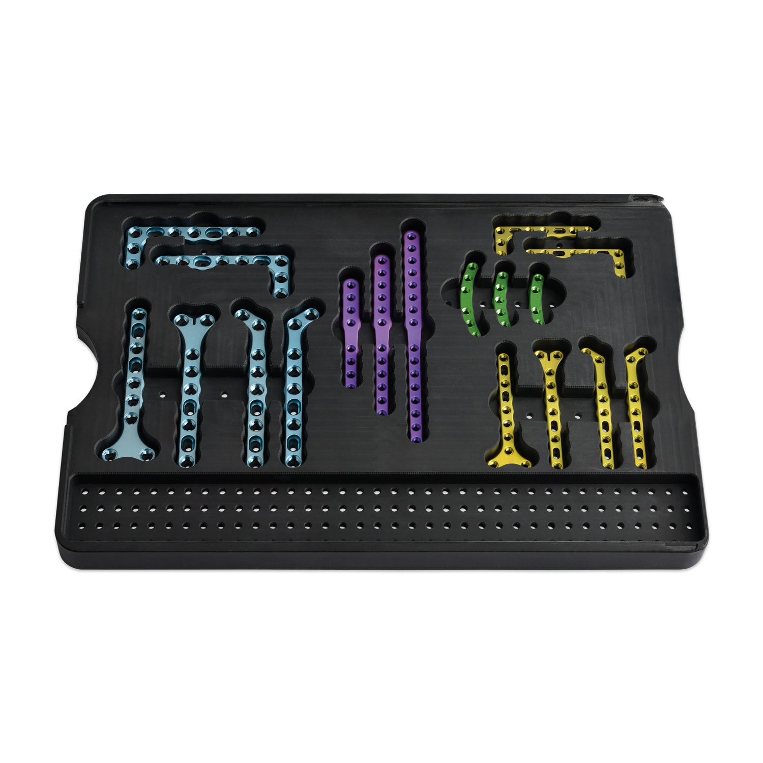 Las placas de titanio del juego de placas EickLoxx Small Contour están disponibles en dos grosores de placa: Las placas de 2,2 mm (amarillo, verde y magenta) pueden bloquearse poliaxialmente con los tornillos de 1,7 mm y 2,3 mm y las placas de 3,0 mm (azul claro) opcionalmente con los tornillos de 2,7 mm, 3,5 mm y 4,0 mm de la serie EickLoxx.