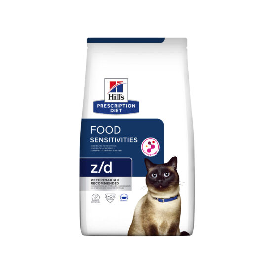 La sensibilidad y la intolerancia a los alimentos son problemas potencialmente graves que pueden provocar irritación de la piel, del pelo y de los oídos o incluso trastornos gastrointestinales. Los gatos que tienen una sensibilidad o intolerancia alimentaria, también llamadas reacciones alimentarias adversas, suelen experimentar una respuesta anormal a la proteína del alimento. Si tu gato sufre una reacción alimentaria adversa, es aún más importante que le des el alimento adecuado. Los nutricionistas y veterinarios de Hill’s han desarrollado la nutrición clínica Prescription Diet z/d especialmente formulada para reducir los signos cutáneos y digestivos de las intolerancias alimentarias. De hecho, z/d es una nutrición clínicamente probada para ayudar a evitar las reacciones alimentarias adversas