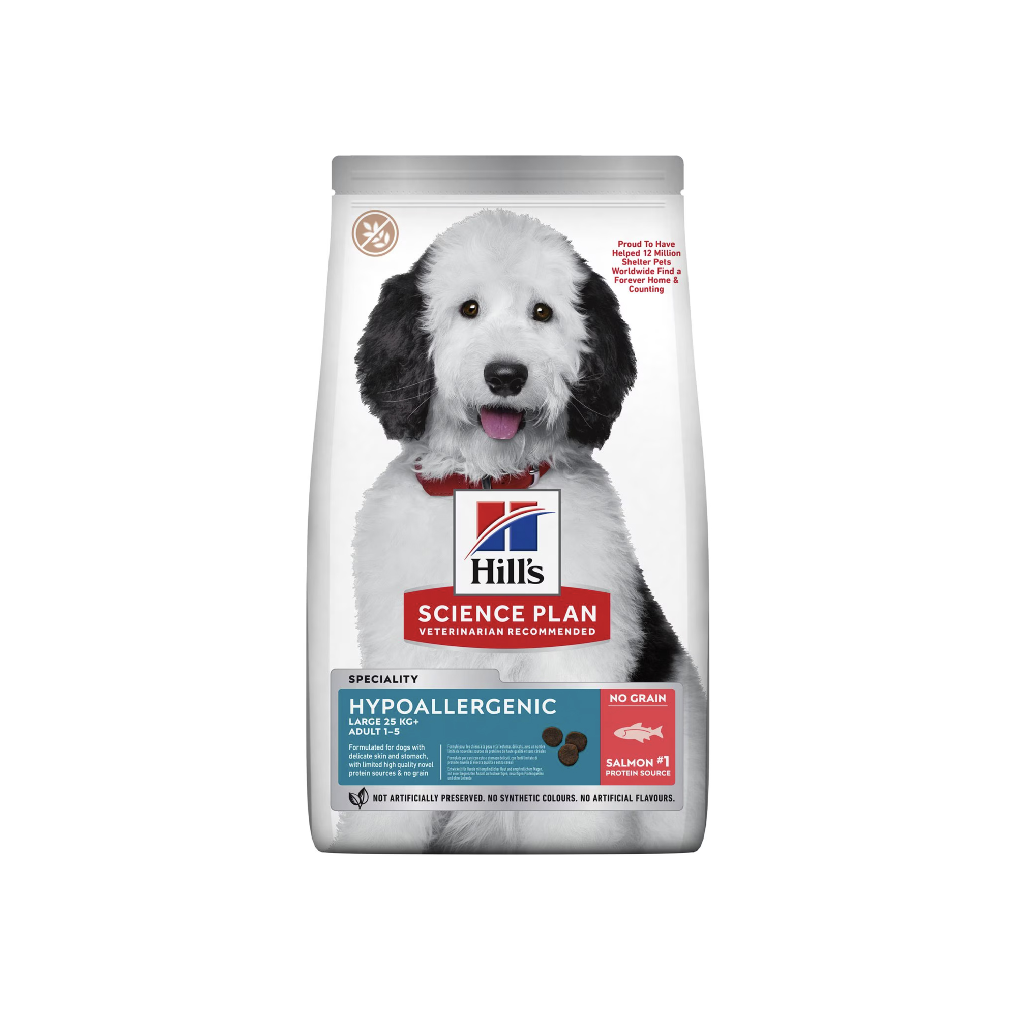 Hill’s Science Plan Hypoallergenic alimento para perros adultos de razas grandes con salmón es una receta suave formulada con fuentes limitadas de proteína novedosa de alta calidad y sin cereales, diseñada para satisfacer las necesidades de los perros con sensibilidades.