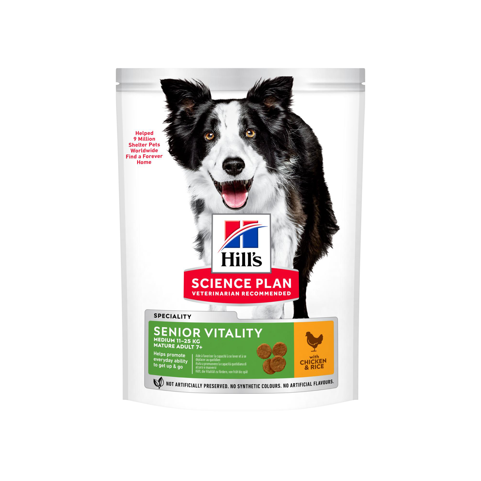 Hill’s Science Plan SENIOR VITALITY RAZAS MEDIANAS ALIMENTO PARA PERROS ADULTOS MAYORES con POLLO y ARROZ es un alimento completo para perros adultos mayores de más de 7 años de edad que ayuda a favorecer su vitalidad en el día a día.