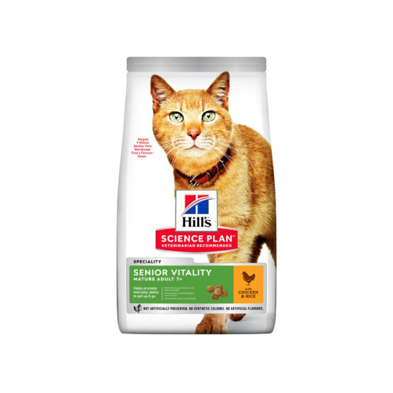 El alimento para gatos mayores HILL’s SCIENCE PLAN Senior Vitality proporciona una nutrición precisamente que ayuda a promover la capacidad diaria para estar activo .