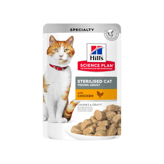 A tu gato le encantará el sabor de HILL’S SCIENCE PLAN Sterilized Cat Alimento para gatos jóvenes con tiernos bocaditos en salsa. Tiene el equilibrio perfecto entre sabor y nutrición con una fórmula exclusiva del control del peso para ayudar a los gatos esterilizados a mantenerse en forma. Elaborado con ingredientes de alta calidad fáciles de digerir.