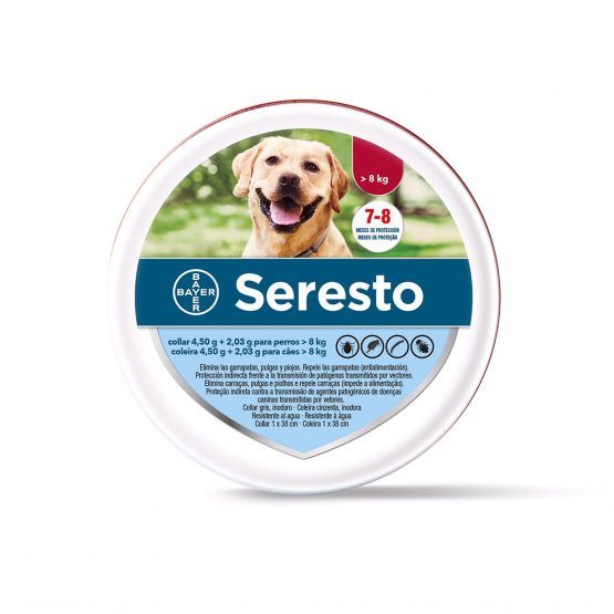 Seresto® es distinto de los collares convencionales contra pulgas y garrapatas. Utiliza una novedosa combinación de materiales que permite la liberación controlada de dosis adecuadas de los principios activos durante 8 meses. Esto confiere una excelente protección de tu perro, no solo porque mata las pulgas y garrapatas, sino también porque repele las garrapatas antes de que le lleguen a picar e ingerir sangre, lo que ayuda a proteger a tu mascota de las enfermedades que estos parásitos pueden transmitir.